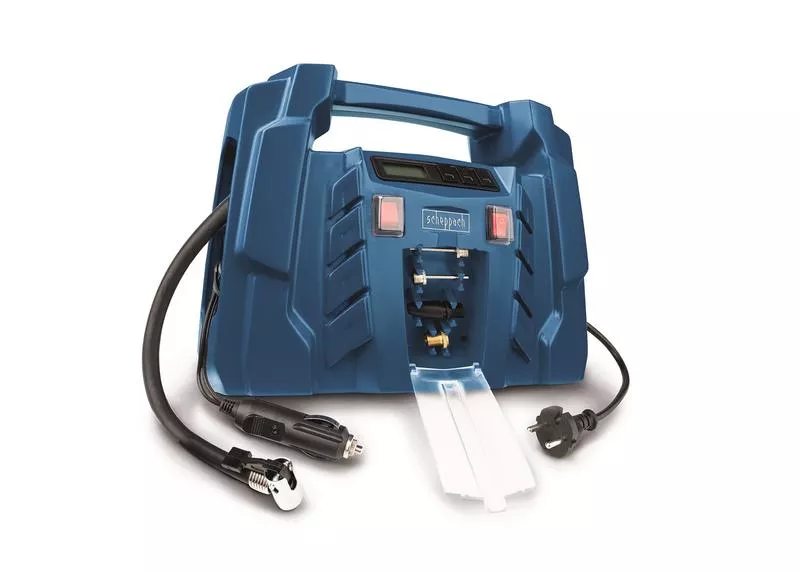 Kompresor Scheppach AIR FORCE 5 je malý, ale užitočný pomocník, ktorého môžete napájať ako z bežnej siete na 230 V, tak aj z bežnej automobilovej zásuvky na 12 V. Uplatní sa tak nielen ako praktický, skladný, a ľahký kompresor vo vašej dielni alebo garáži, ale využijete ho aj na cestách v aute alebo karavanu. Obsluha je veľmi jednoduchá. Na digitálnom displeji vidíte aktuálnu hodnotu tlaku. Ten si ide takisto v rozmedzí 0,1 až 8 bar predvoliť a po dosiahnutí nastaveného tlaku sa kompresor automaticky vypne. Vďaka veľkému množstvu rôznych koncoviek a maximálnemu tlaku až 8 barov si hravo poradí s fúkaním pneumatík motocyklov, bicyklov, áut, terénnych štvorkoliek, lôpt, matracov, nafukovacích člnov, raftov a pod. Všetko príslušenstvo, vrátane dvoch elektrických káblov, tlakovej hadice 0,6 ma štyroch rôznych koncoviek je šikovne ukryté vnútri kompresora, takže sa Vám nič nestratí. Pohodlné madlo uľahčí prenášanie. Kompresor je vybavený najmodernejším motorom s bezolejový technológiou. Kontrola oleja, jeho dopĺňanie alebo výmena tak vôbec nie je potrebné a kompresor je tak vždy pripravený odviesť svoju prácu. Jeho rozmery a hmotnosť iba 1,9 kg ho tiež predurčujú k využitie pri stanovanie, kempovanie a iných outdoorových aktivitách.