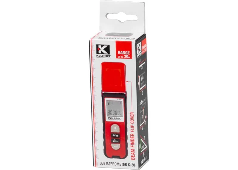 Merač KAPRO® 363 slúži na meranie vzdialenosti, plochy a objemu. S kontinuálnym meracím režimom meria najkratšiu vzdialenosť k cieľu. Režim nepriameho merania využíva Pytagorovú vetu na výpočet nedostupných miest. Dosah merača je až 30 metrov. Interná pamäť uchováva 20 meraní. K dispozícii ponúka výber z dvoch referenčných bodov merania a z piatich meracích jednotiek.